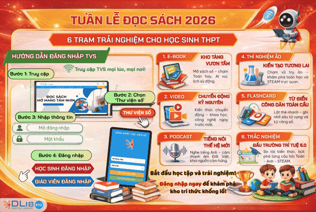 Tuần lễ đọc sách 2026 đang chờ đón các em với những trải nghiệm tuyệt vời! Đây là cơ hội không thể bỏ lỡ để các em tham gia vào một hành trình học tập đầy thú vị, mở rộng kiến thức và rèn luyện kỹ năng. Hãy cùng Thư viện số DLib K12 và Trường THCS & THPT Tây Sơn vươn mình trong kỷ nguyên số, kiến tạo tương lai ngay từ hôm nay!